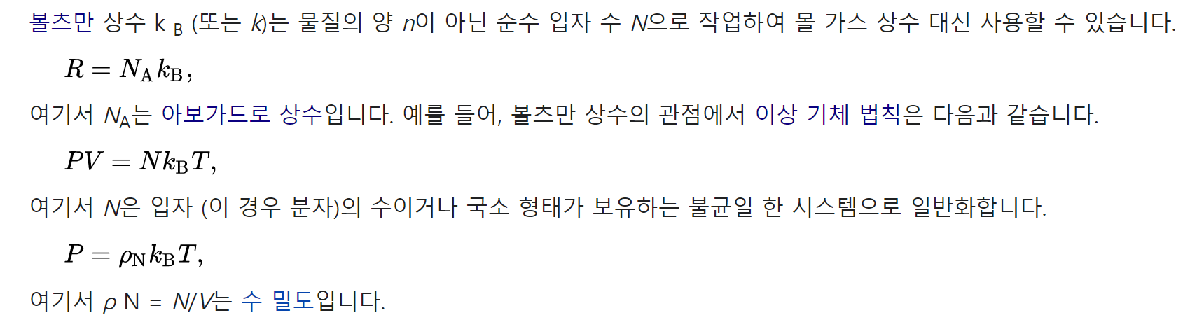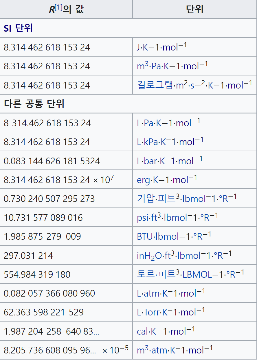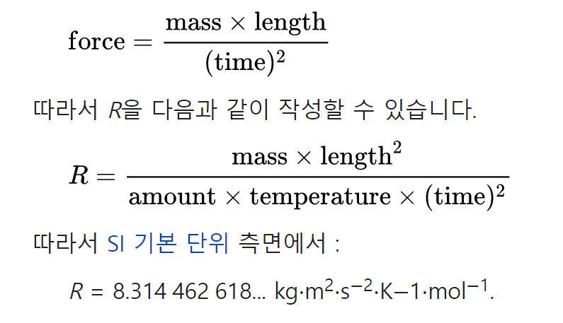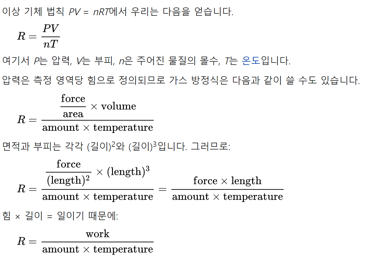 일 또는 에너지를 나타내는 단위 집합 (예 : 줄), 절대 눈금으로 온도도를 나타내는 단위 (예 : 켈빈 또는 랭킨) 및 시스템에서 거시적 질량 및 기본 입자 번호의 방정식을 허용하는 몰 또는 유사한 순수 수를 지정하는 단위 시스템으로 표현 될 수 있습니다. 이상 기체와 같은(아보가드로 상수 참조).