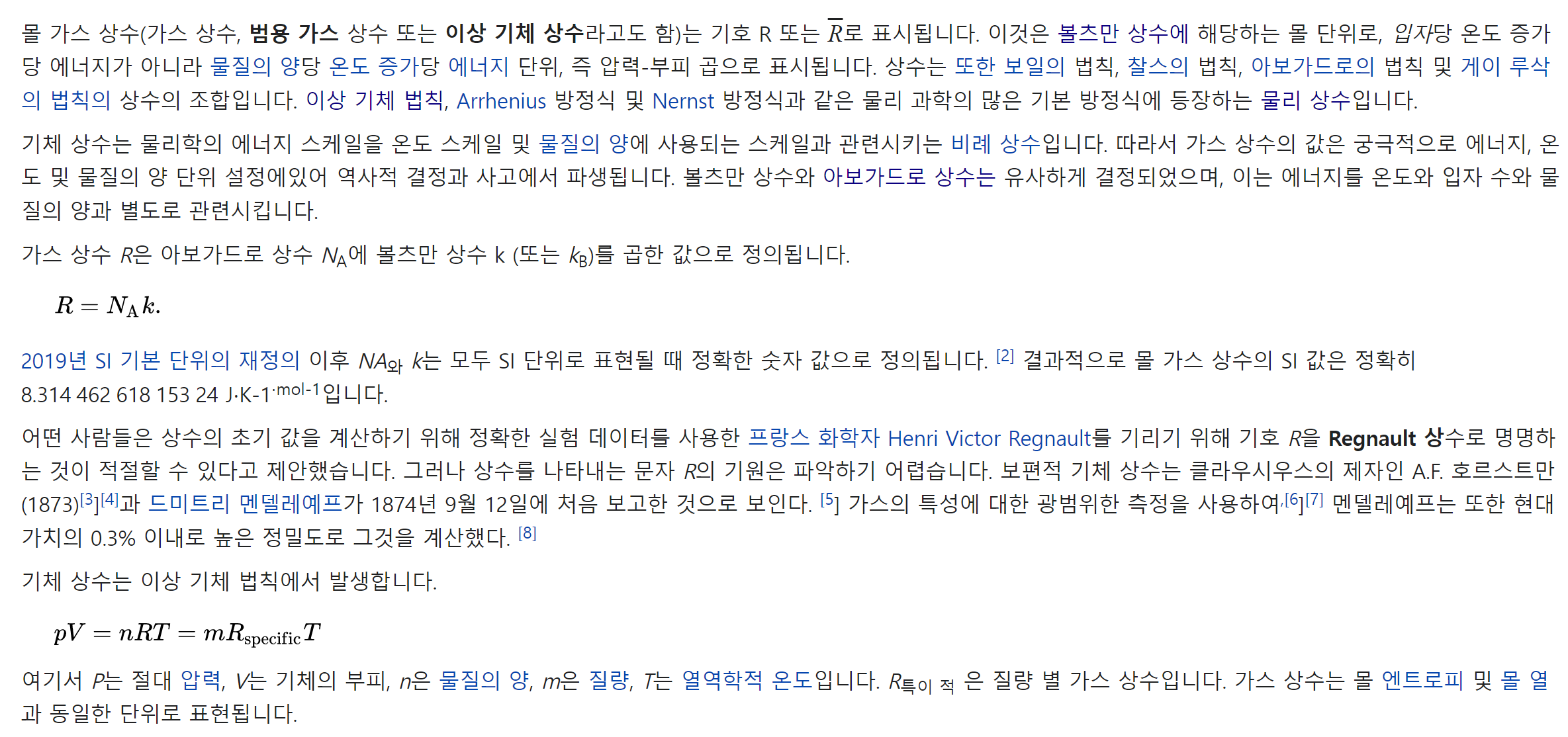 특히 엔지니어링 응용 분야에서 특정 가스 상수를 기호 R로 나타내는 것이 일반적입니다. 이러한 경우 범용 가스 상수에는 일반적으로 구별하기 위해 R과 같은 다른 기호가 부여됩니다. 어쨌든, 가스 상수의 문맥 및/또는 단위는 보편적 또는 특정 가스 상수가 언급되고 있는지 여부를 명확히 해야 한다. [10]