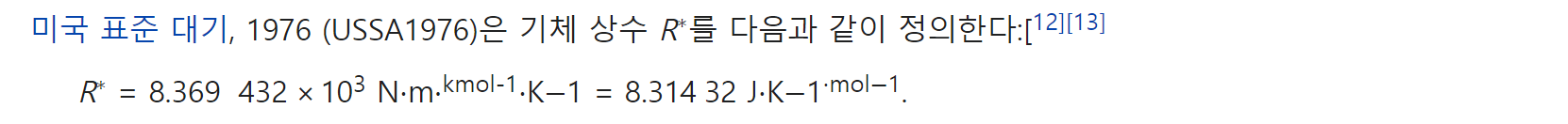 상수에 1000의 결과 인수와 함께 킬로몰의 사용에 유의하십시오. USSA1976은 이 값이 아보가드로 상수 및 볼츠만 상수에 대해 인용된 값과 일치하지 않음을 인정합니다. [13] 이 차이는 정확도에서 크게 벗어나지 않으며 USSA1976은 표준 대기의 모든 계산에 이 R∗ 값을 사용합니다. ISO 값 R을 사용할 때 계산된 압력은 11km에서 0.62파스칼(17.4센티미터 또는 6.8인치의 차이에 해당) 및 20km에서 0.292Pa(33.8cm 또는 13.2인치의 차이에 해당)만큼 증가합니다.