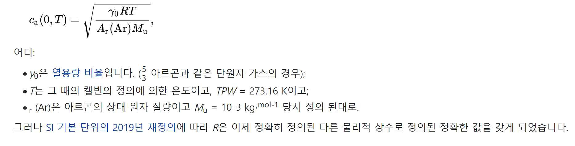 2006 년 현재, R의 가장 정확한 측정은 다른 압력 P에서 물의 삼중점의 온도 T에서 아르곤의 소리 ca (P, T)의 속도를 측정하고 제로 압력 한계 ca(0, T)로 외삽하여 얻어졌습니다. 그런 다음 R의 값은 관계에서 얻습니다.