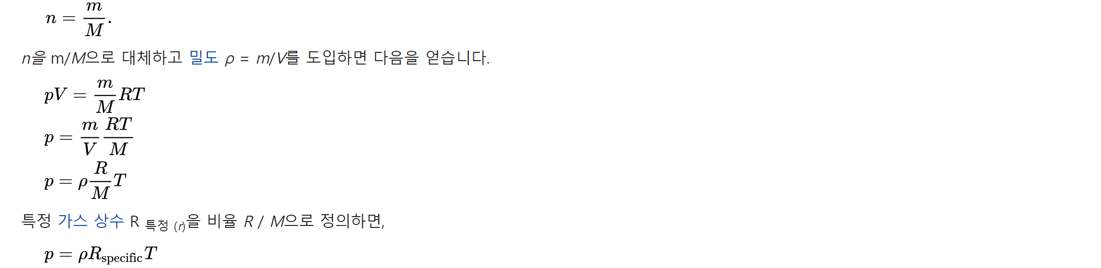 따라서, 이상 기체 법칙의 대안적인 형태가 유용할 수 있다. 화학량 n (몰)은 가스의 총 질량 (m) (킬로그램)을 몰 질량 M (몰 당 킬로그램)으로 나눈 값과 같습니다.