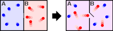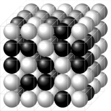 A three-dimensional lattice filled with two molecules A and B, here shown as black and white spheres. Lattices such as this are used - for example - in the Flory–Huggins solution theory