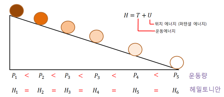 위의 상황에서 속도가 계속 증가하면서 운동량은 시간에 따라 점점 커지지만, 운동에너지와 위치에너지의 합인 헤밀토니안은 변하지 않는것을 볼 수 있습니다. 그러니까 헤밀토니안은 시간에 대해 대칭성을 가지고 있는 것이고, 이 시간 대칭성을 가지고 있는 헤밀토니안은 에너지의 합입니다.