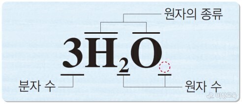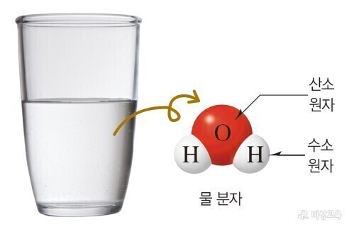 예) 물은 물 분자로 이루어진다. 물 분자는 수소 원자 2개와 산소 원자 1개로 이루어지므로 물을 이루는 원자의 종류는 수소와 산소 2가지이다.