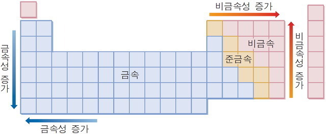 금속·준금속·비금속 등으로 설명되는 일반적인 화학적 성질은 매우 단순한 형태로 주기율표와 관련이 있다. 즉 주기율표에서 왼쪽과 아래쪽으로 갈수록 금속성이 강해지며 비활성 기체를 제외하면 오른쪽과 위쪽으로 갈수록 비금속성이 강해진다. 준금속들은 붕소와 폴로늄을 잇는 대각선 부근에 분포되어 있다. 밀접하게 연관되어 있는 성질은 원자가 그들의 전자를 유지하고 다른 원소의 전자를 끌어당기는 경향을 나타내는 전기음성도이다. 원소의 전기음성도는 이온화퍼텐셜, 전자친화도, 산화-환원 전위, 화학결합 형성 에너지를 비롯한 여러 성질로부터 알 수 있다. 전기음성도는 주기율표상에서 비금속성과 같은 식으로 원소의 위치에 따라 다르다고 알려져 있으며 따라서 플루오르가 전기음성도가 가장 큰 원소이고 세슘(또는 프랑슘)이 전기음성도가 가장 작은(즉 전기양성도가 가장 큰) 원소이다.