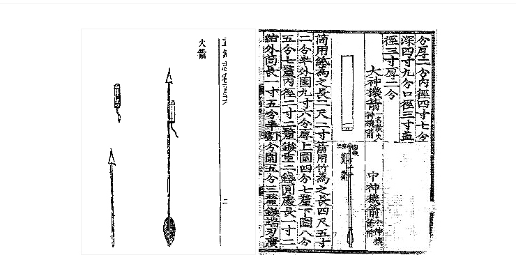 1621년 중국에서 편찬된 [무비지]에 나오는 로켓 화기(왼쪽)