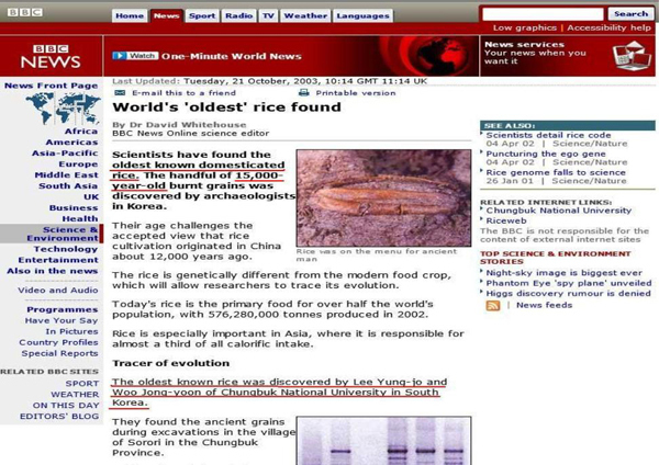 ▲ BBC 뉴스(인터넷판)에 소개된 "세계 최고의 벼가 발견되다"(2013.10.21)