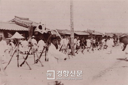 | 프랑스파리외방전교회 소속 신부가 1885년 찍은 고종황제 행차 모습. 사진 속 태극기에 4괘 중 ‘감’(점선 안)이 선명하다. 공개자 정성길 계명대 동산의료원 명예박물관장은 “국가행사에 등장하는 태극기로는 가장 오래된 것”이라고 말했다. 2016.02.29 태극기는 고종황제의 금척.. .. 3ㆍ1 절을 맞아 전국이 다시 한번 태극기의 물결로 뒤덮였다. 이에 맞춰 광복회 광주ㆍ전남 지부에서는 ‘태극기 특별기획전’을 열고, 미공개 태극기 사진을 다수 공개했다. 이 가운에 눈길을 끈 것은 1885년 고종 황제의 어가 행렬을 이끄는 대형 태극기의 모습이다. 전문가들은 이 깃발이 국가 행사에 등장한 가장 오래된 태극기라고 한다. 고종황제 행렬이 종로를 지나고 있다. 1885년 프랑스 파리 외방전교회 소속 신부가 촬영한 것으로, 어가 앞에 대형 태극기가 보인다. 신식 군대와 전통 군대가 섞여서 어가를 오휘하는 모습이 이채롭다. 태극기는 그동안 1882년 8월 수신사 박영효가 일본에 가는 메이지마루호 선상에서 즉석에서 만든 것처럼 잘못 알려져 왔다. 일국의 상징인 국기를 대신(大臣)이 즉석에서 만들어 내걸았다는 얼토당토않은 비상식적인 이야기가 마치 정설처럼 퍼져 있는 것이다. 이는 시급히 바로 잡아야 할 문제다. 박영효가 태극기를 처음 만들어 내걸었다는 주장은 조선시대 관료 조직을 아프리카 어느 부족 수준 정도의 것으로 보지 않는 이상 상상도 할 수 없는 발상이다. |