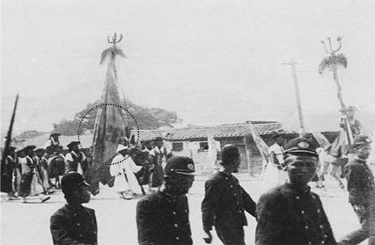 프랑스파리외방전교회 소속 신부가 1885년 찍은 고종황제 행차 모습. 사진 속 태극기에 4괘 중 ‘감’(점선 안)이 선명하다. 공개자 정성길 계명대 동산의료원 명예박물관장은 “국가행사에 등장하는 태극기로는 가장 오래된 것”이라고 말했다.