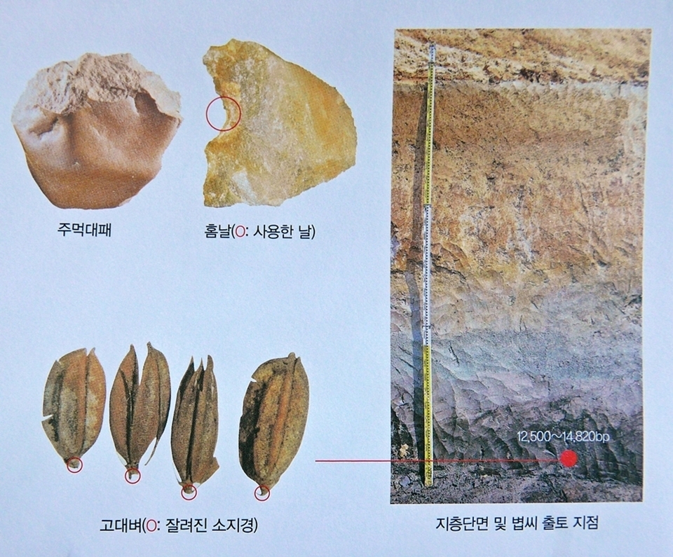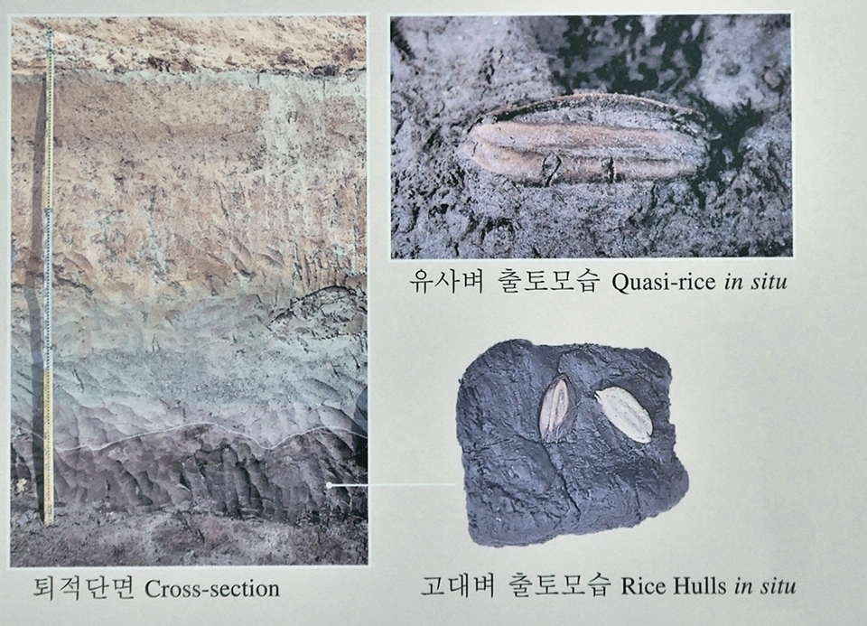 청주 소로리 볍씨는 1994년 오창과학산업단지 조성계획이 수립돼 충북대학교 박물관에서 사전 지표조사 실시를 시작으로 1997~98년 충북대, 단국대, 서울시립대, 한국지질자원연구원이 연합조사로 1차 발굴, 2001년 충북대학교 박물관에서 토탄층 추가 조사로 2차 발굴을 진행하게 됩니다. 소로리 구석시대의 토탄층에서 볍씨가 발굴되고 그 이전의 층에서는 유사벼가 발굴되었습니다.