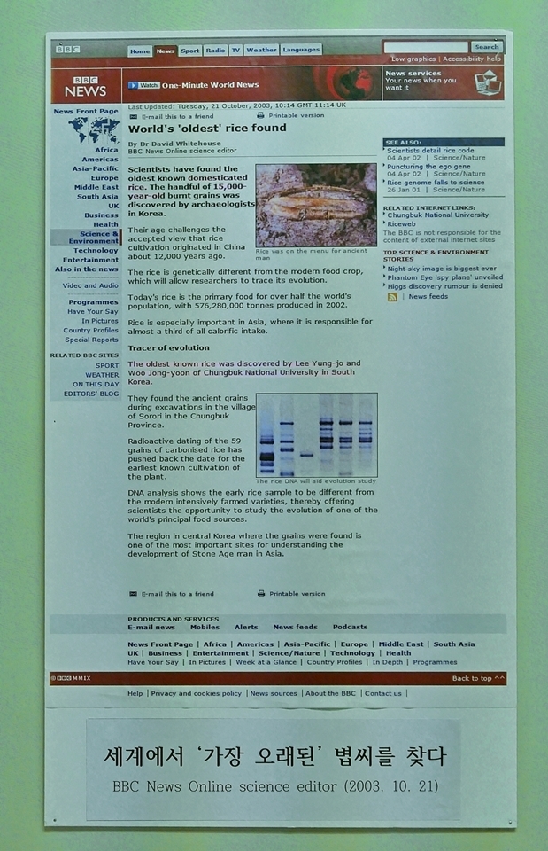 2003년 영국 BBC 방송은 '세계에서 가장 오래된 볍씨가 소로리 유적에서 과학자들에 의해 발견되었다'라는 타이틀로 보도하고 인터넷 판으로 다시 전 세계에 보도했고 여러 국제회의에서도 공인됐습니다. 그전까지 밝혀진 가장 오래된 볍씨는 중국 호남성 옥섬암 동굴유적 출토볍씨였는데 이보다 훨씬 앞선 소로리 볍씨가 발견된 것입니다.