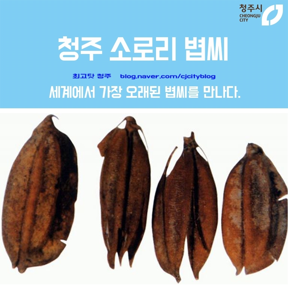 세계에서 가장 오래된 청주 소로리 볍씨출토된 볍씨는 서울대학교 방사선탄소연대측정 연구실과 미국의 지오크론 연구실 및 애리조나 대학교로 보내져 13,000~1,5000년 전의 절대 연대 값을 얻어 소로리 볍씨가 세계에서 가장 오래된 볍씨임이 확인됐습니다. 이것을 후에 다시 미국 캠브리지대의 세계 공용 측정프로그램으로 계산하니 BC 1만5천118yr(year)로 밝혀져 그 연대를 '약 1만7천년 전'으로 수정하게 되었다고 하네요. '소로리볍씨'에는 'Oryza sative coreaca(오리자 사티바 코레아카)' 즉, '한국의 고대벼' 라는 학명도 생겼습니다.
