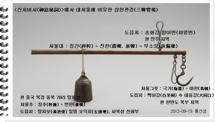 삼한의 도시도 저울의 척도로 비유하면서 3도시가 원방각처럼 하나를 이룬다고 해설하는 것입니다.