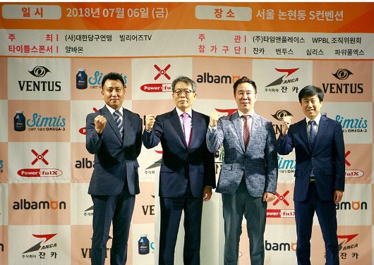 구단 스폰서로 '2018 알바몬 WPBL 여자 프리미어당구리그'에 참가하는 4개 구단주. 왼쪽부터 잔카 윤영선 대표이사, 심리스 심범섭(48회) 대표이사, 파워풀엑스 박인철 대표이사, 벤투스 유재수 대표이사.