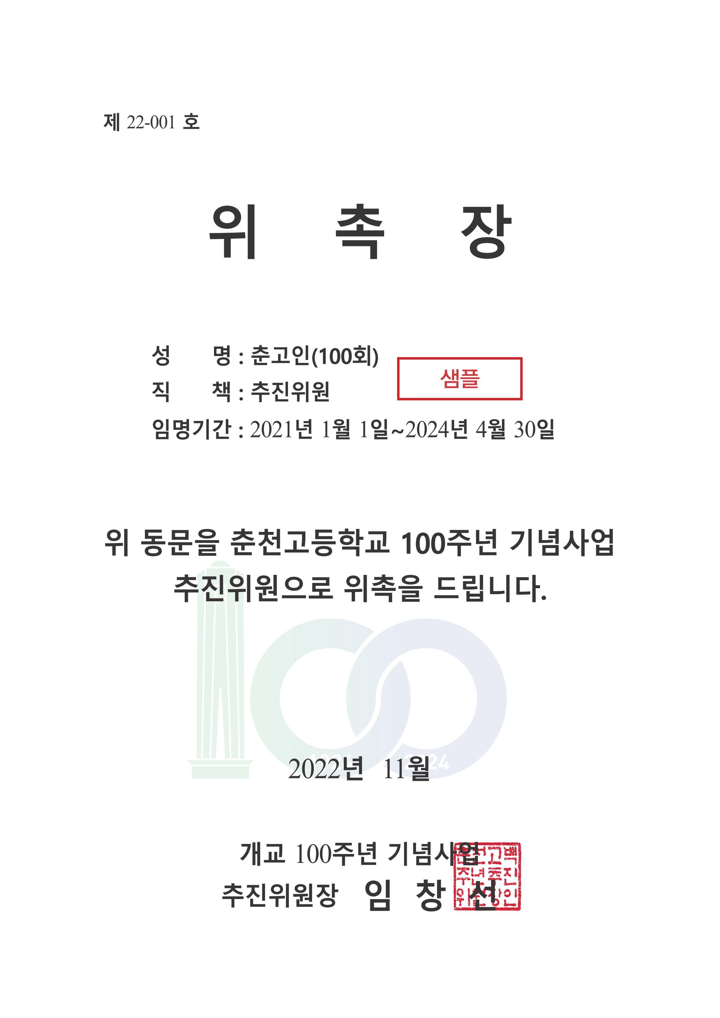 춘천고등학교 100주년 기념사업 추진위원회(위원장 임창선. 43회)는 100주년 추진위원들께 ‘모바일 위촉장’을 제작하여 11월 중순쯤 전달할 예정이다. 약 1,000여 명이 추진위원으로 기금 조성에 참여하고 있고 그중 700여 명의 납부 동문이 위촉장을 받는 대상자이다. 100주년 추진위원들에게는 춘천고 100년사(인쇄본) 무료 발송, 개교 100주년 기념식 우선 초대, 역사관에 성명 기록 등 특전이 주어진다.
