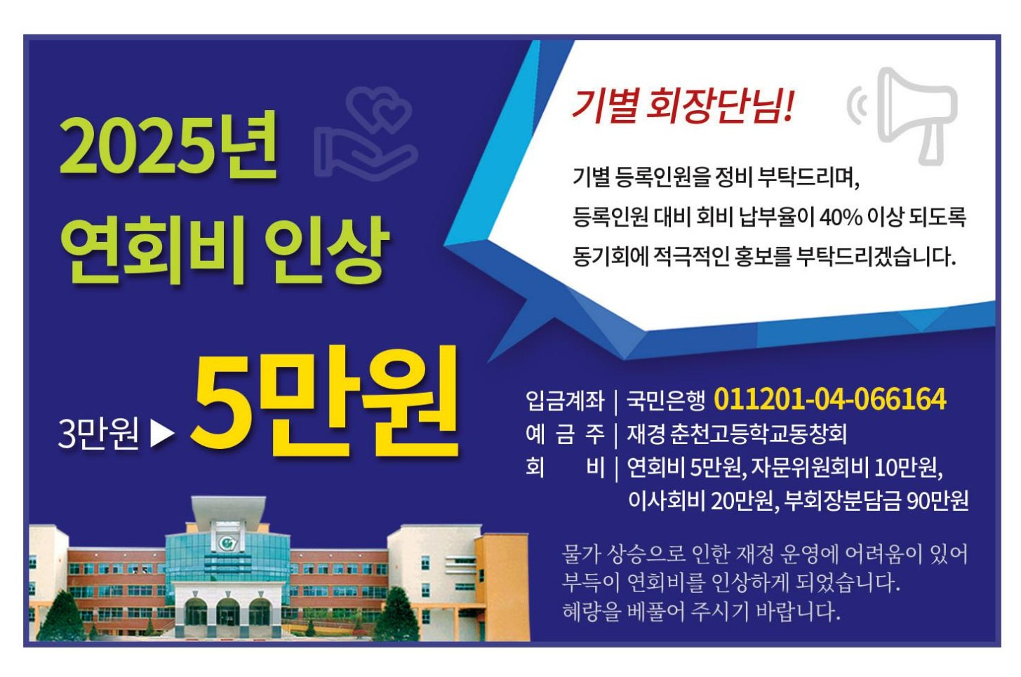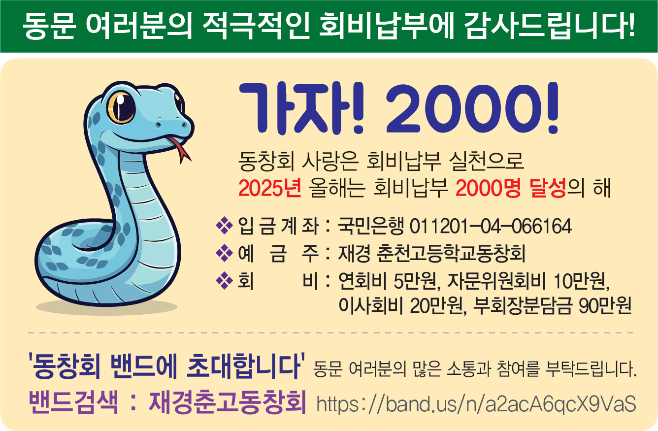 <2025년 회비납부 안내-연회비 50,000원으로 인상> 작성자재경춘고|작성시간25.01.02|조회수224 목록 댓글 0 글자크기 작게가 글자크기 크게가 다음검색 현재 게시글 추가 기능 열기 북마크 공유하기 신고 센터로 신고 댓글 댓글 0 댓글쓰기 답글쓰기 댓글 리스트