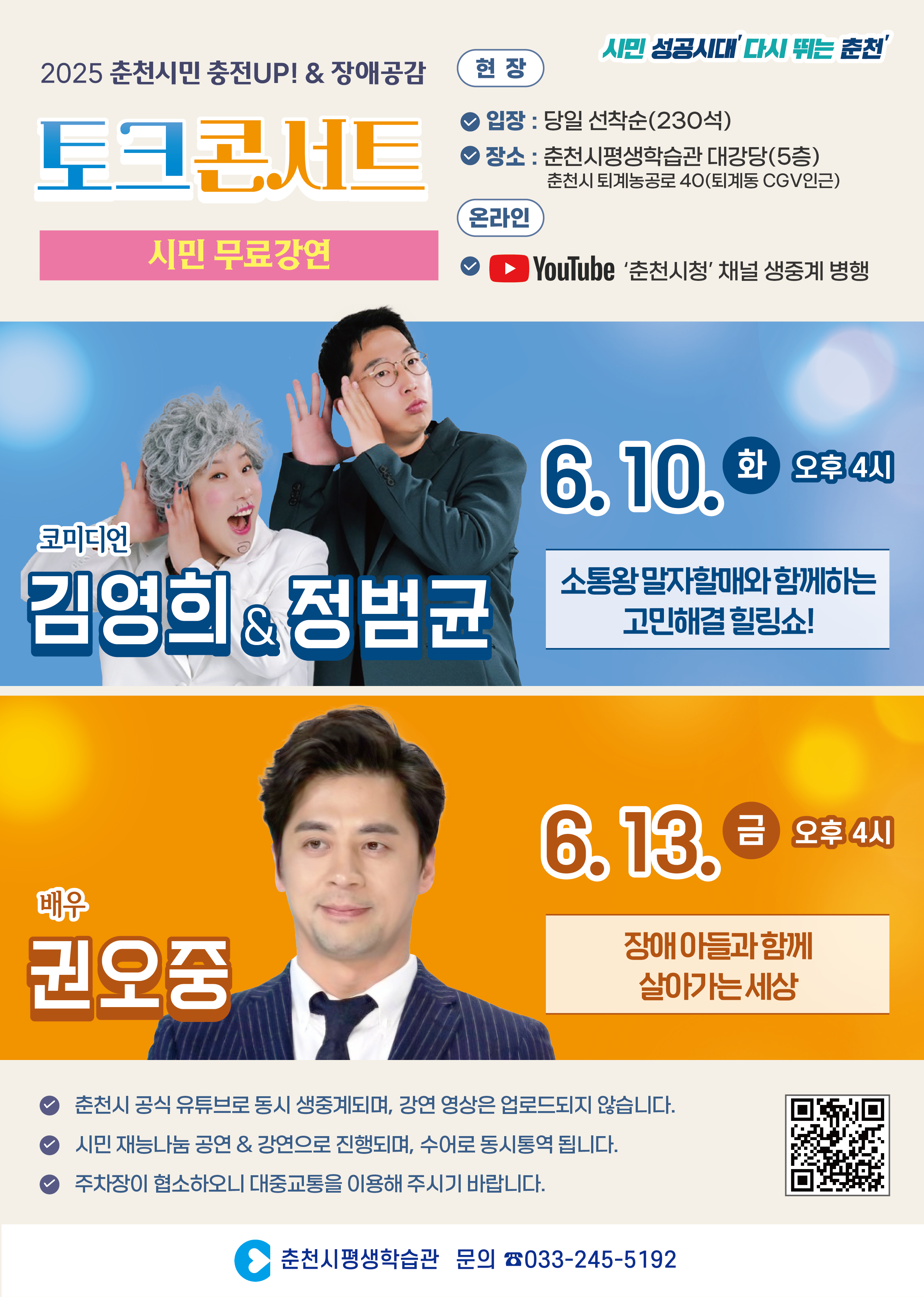 '2025년 춘천시민 충전UP! & 장애공감 토크콘서트' 는 장애인과 비장애인이 함께 하는 콘서트입니다.