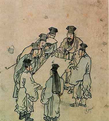 그런데 김홍도 그림에서는 한 명의 여자와 일곱 명의 남자를 모델로 생활 풍속도를 그려낸다. 때로는 그 한 명의 여신선은 암시적으로 생략하면서 일곱 남자를 주로 그려 보여주고 있다는 것을 흥미로운 사실을 찾아낼 수 있다.