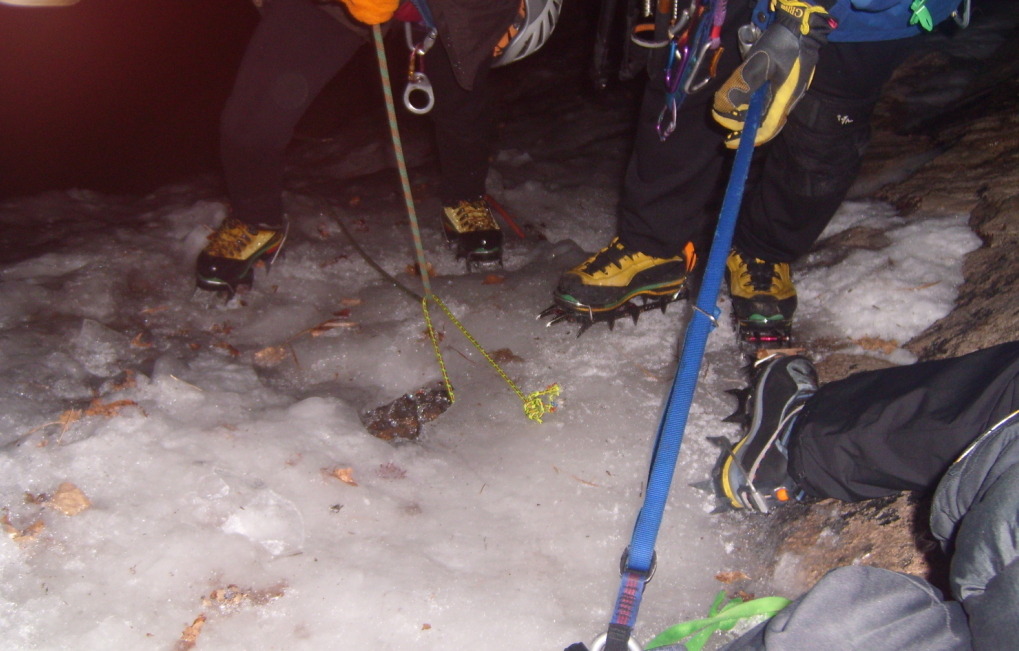 자가용몰듯 동대테라스까지 미끄러지게 등반하던 금석형 테라스에서 확보지점이 얼음에 묻혀 못 찾고