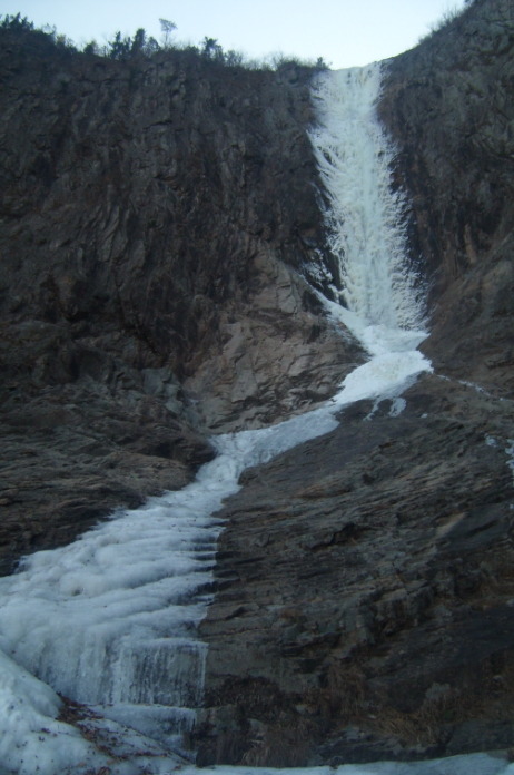 쌍천을 건너며본 국사대빙폭은 아래부분이 떨어져내렸다 아침에는 토왕빙폭등반이 안되면 저곳을가려했다.