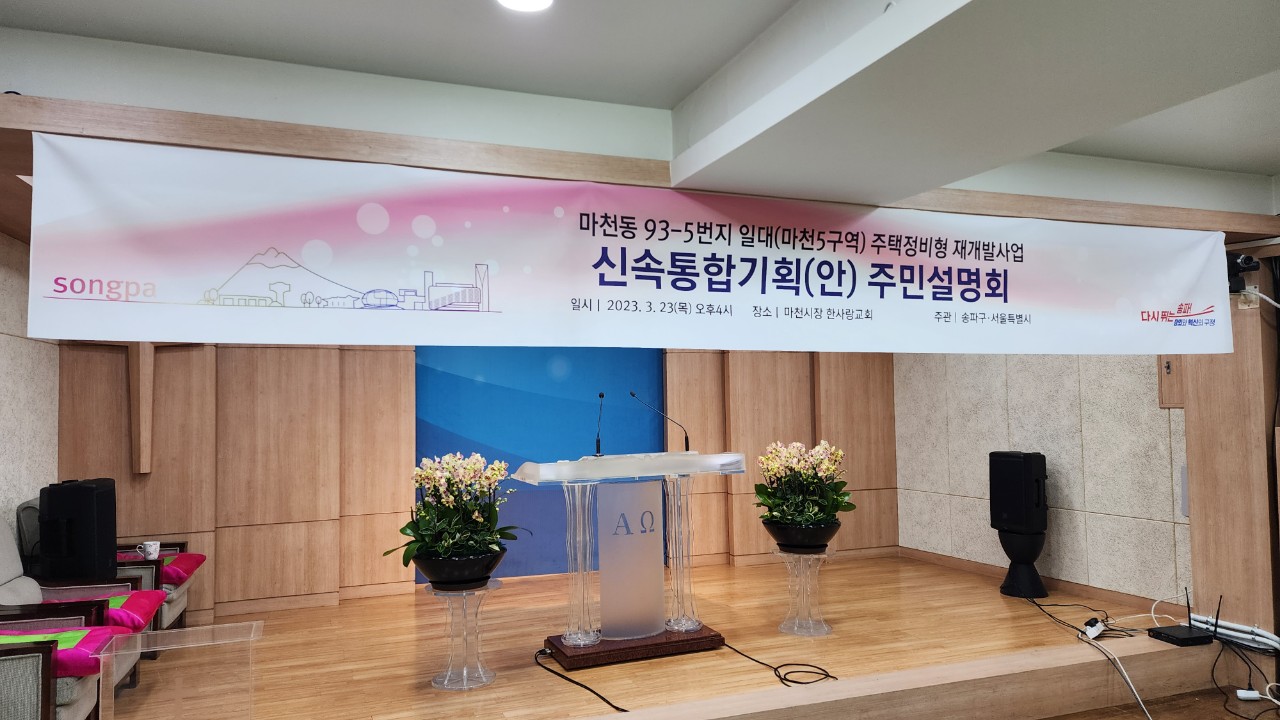 그동안 기다려 오던 마천5구역 주민설명회가 3월23일 오후4시 마천시장 한사랑교회에서 서울시와 송파구청 주관으로 바쁜데도 불구하고 많은 관심을 갖고 조합원분들이 많이 참여하여 개최 되었습니다.