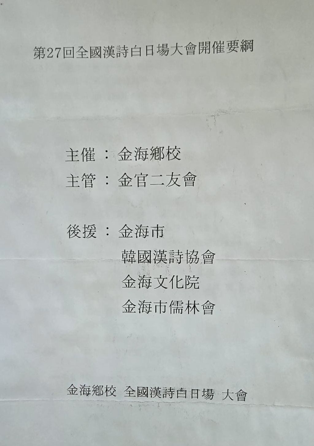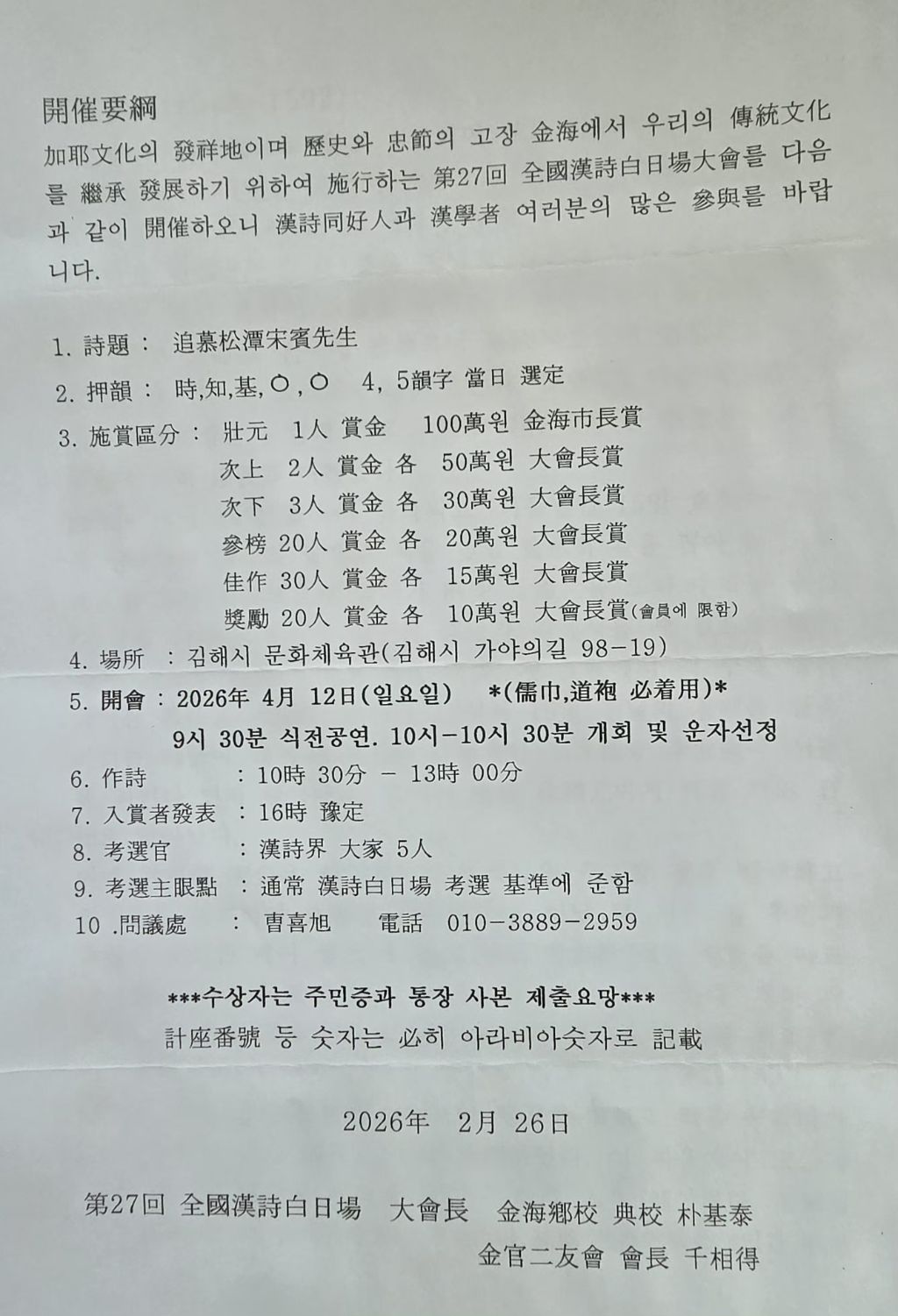 第27回全國漢詩白日場 大會 開催要綱(제27회전국한시백일장대회 개최요강) 작성자석보송유장|작성시간26.03.16|조회수12 목록 댓글 0 글자크기 작게가 글자크기 크게가 다음검색 현재 게시글 추가 기능 열기 북마크 공유하기 신고 센터로 신고 댓글 댓글 0 댓글쓰기 답글쓰기 댓글 리스트