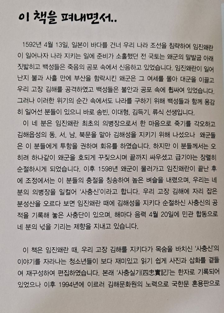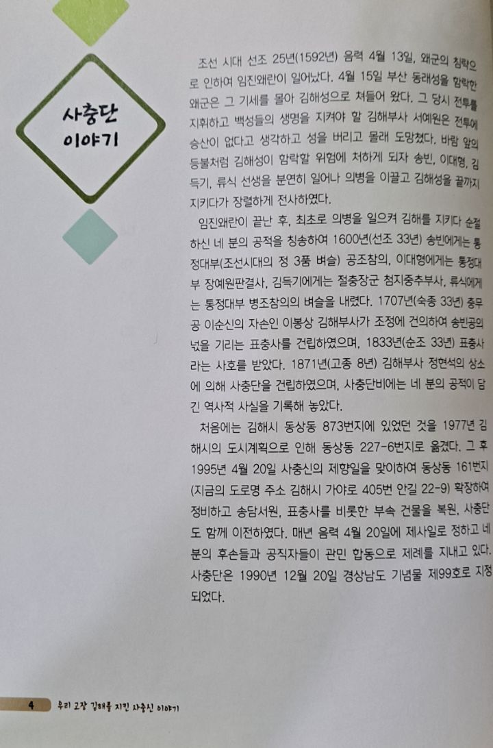 우리고장 김해를 지킨 사충신 이야기 / 김해시 작성자石普(송유장)|작성시간22.04.23|조회수100 목록 댓글 0 글자크기 작게가 글자크기 크게가 다음검색 현재 게시글 추가 기능 열기 북마크 공유하기 신고 센터로 신고 댓글 댓글 0 댓글쓰기 답글쓰기 댓글 리스트