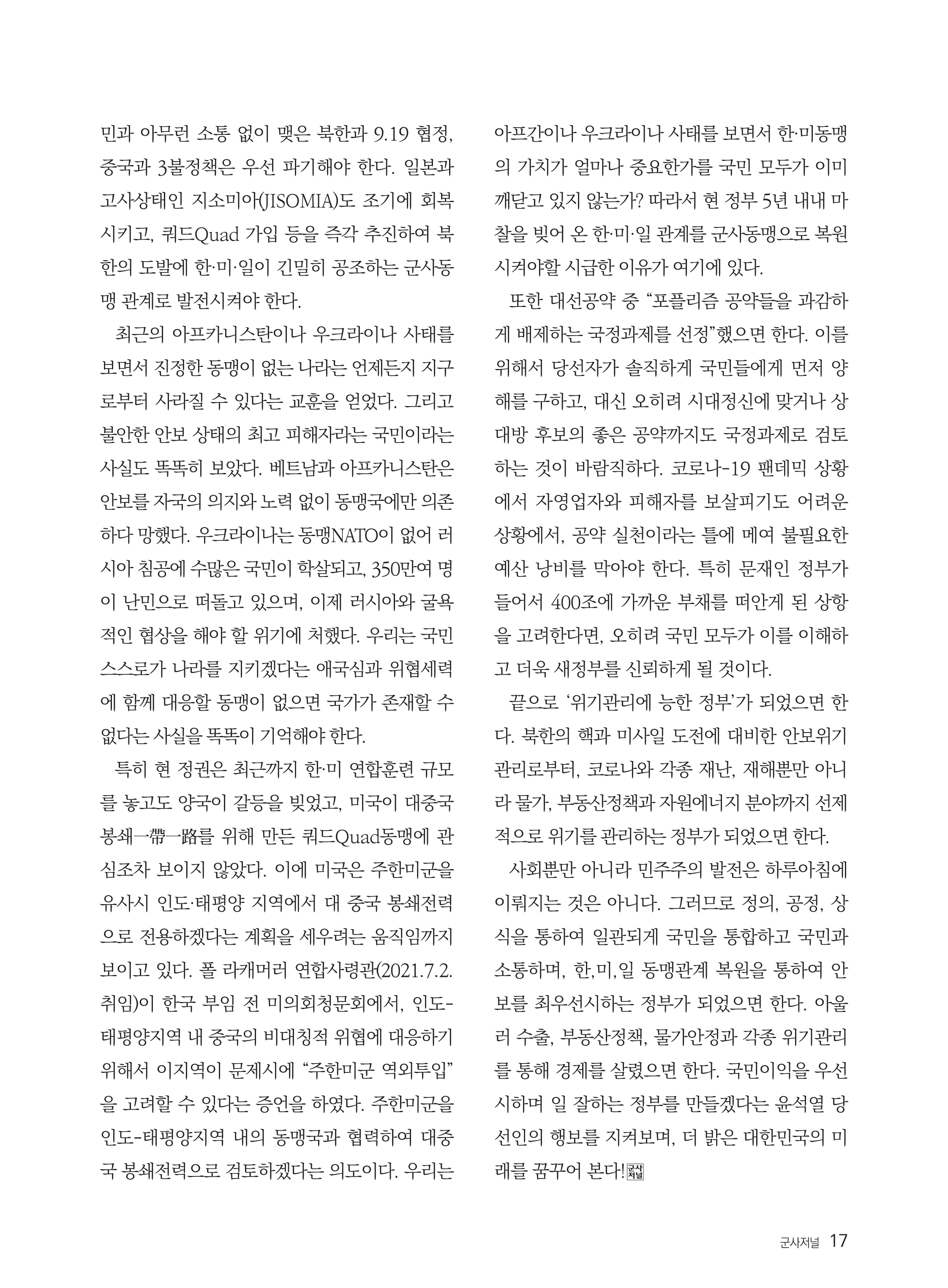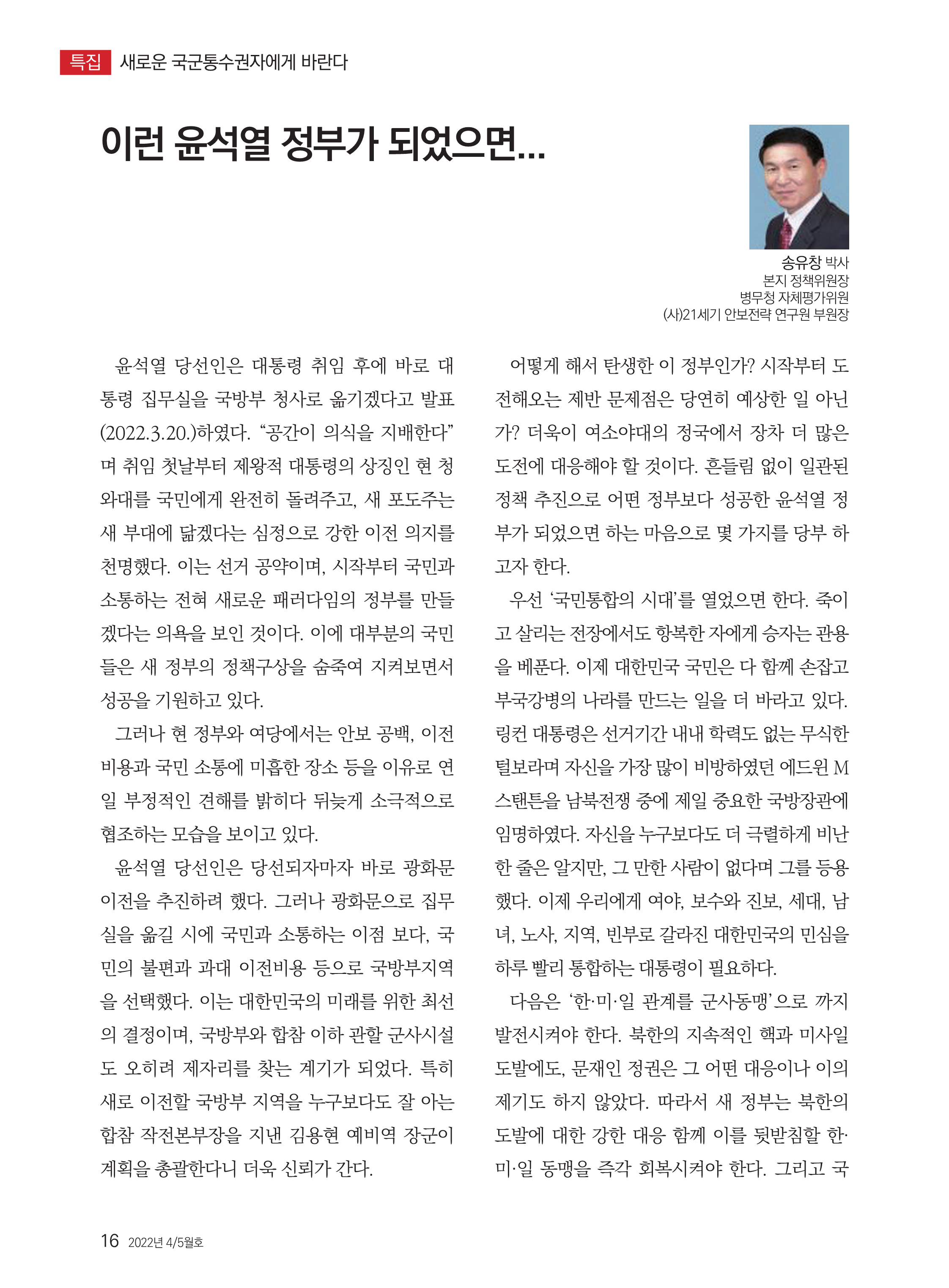 윤석열 정부에 바라는 글(월간 ''군사저널'' 2022.5월호) 작성자장군|작성시간22.05.04|조회수69 목록 댓글 0 글자크기 작게가 글자크기 크게가 다음검색 현재 게시글 추가 기능 열기 북마크 공유하기 신고 센터로 신고 댓글 댓글 0 댓글쓰기 답글쓰기 댓글 리스트