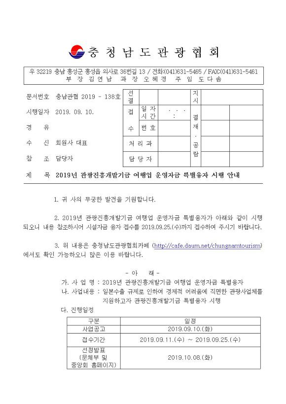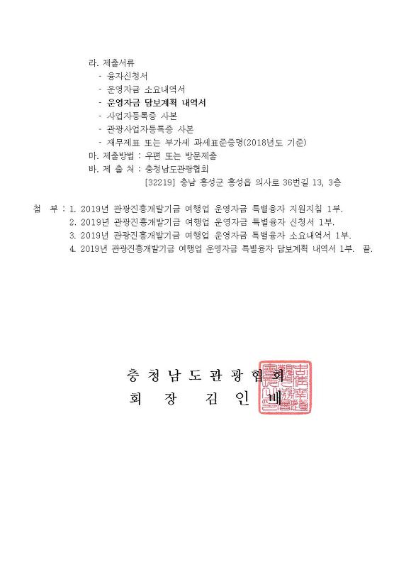 2019년 관광진흥개발기금 여행업 운영자금 특별융자 시행 안내 작성자충청남도관광협회|작성시간19.09.10|조회수26 목록 댓글 0 글자크기 작게가 글자크기 크게가 [첨부1] 2019년 관광진흥개발기금 여행업 운영자금 특별융자 지원지침.pdf [첨부2] 2019년 관광진흥개발기금 여행업 운영자금 특별융자 신청서.hwp [첨부3] 2019년 관광진흥개발기금 여행업 운영자금 특별융자 소요내역서.hwp [첨부4] 2019년 관광진흥개발기금 여행업 운영자금 특별융자 담보계획 내역서.hwp 첨부파일첨부된 파일이 6개 있습니다. jpg 파일 2019-138호(2019년 관광진흥개발기금 여행업 운영자금 특별융자 시행 안내)001.jpg 다운로드 jpg 파일 2019-138호(2019년 관광진흥개발기금 여행업 운영자금 특별융자 시행 안내)002.jpg 다운로드 pdf 파일 [첨부1] 2019년 관광진흥개발기금 여행업 운영자금 특별융자 지원지침.pdf 다운로드 hwp 파일 [첨부2] 2019년 관광진흥개발기금 여행업 운영자금 특별융자 신청서.hwp 다운로드 hwp 파일 [첨부3] 2019년 관광진흥개발기금 여행업 운영자금 특별융자 소요내역서.hwp 다운로드 hwp 파일 [첨부4] 2019년 관광진흥개발기금 여행업 운영자금 특별융자 담보계획 내역서.hwp 다운로드 다음검색 현재 게시글 추가 기능 열기 북마크 공유하기 신고 센터로 신고 댓글 댓글 0 댓글쓰기 답글쓰기 댓글 리스트