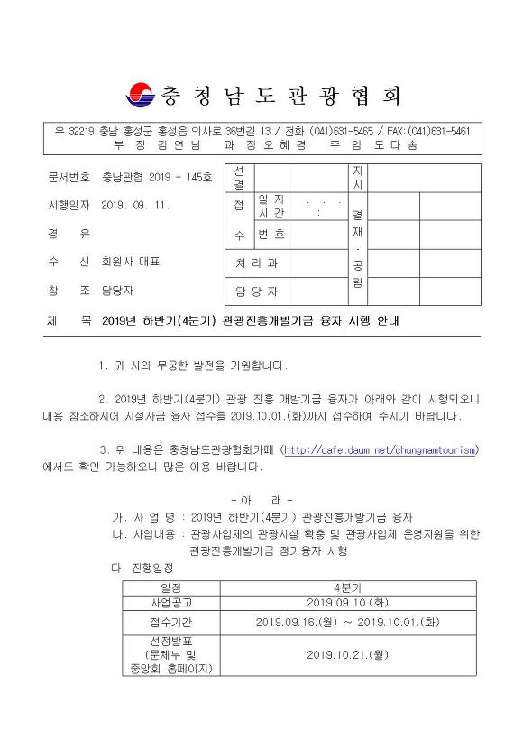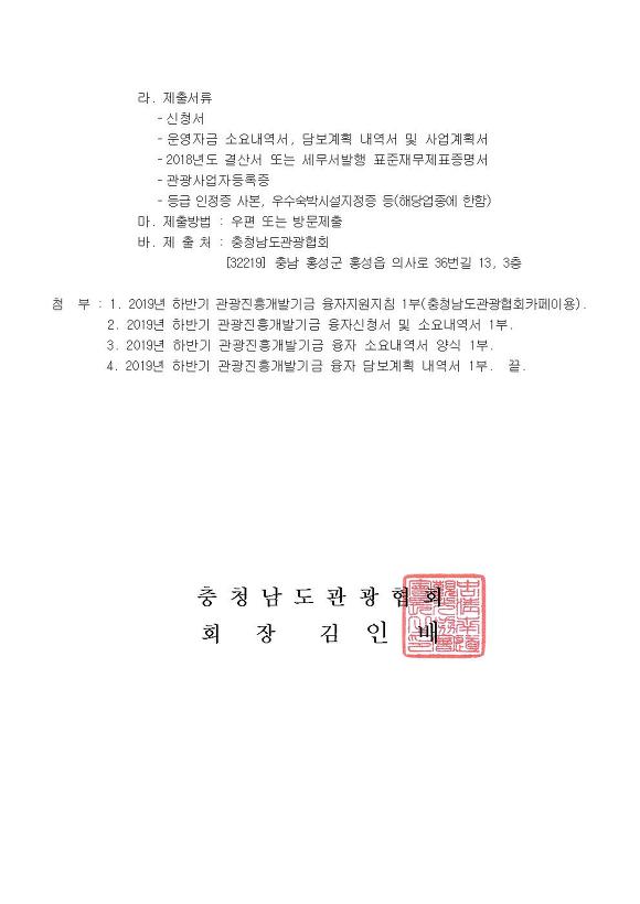 2019년 하반기(4분기) 관광진흥개발기금 융자 시행 안내 작성자충청남도관광협회|작성시간19.09.11|조회수32 목록 댓글 0 글자크기 작게가 글자크기 크게가 [첨부1] 2019년 하반기 관광진흥개발기금 융자 지원지침.pdf [첨부2] 2019년 하반기 관광진흥개발기금 융자 신청서.hwp [첨부3] 2019년 하반기 관광진흥개발기금 융자 소요내역서.hwp [첨부4] 2019년 하반기 관광진흥개발기금 융자 담보계획 내역서.hwp 첨부파일첨부된 파일이 6개 있습니다. jpg 파일 2019-145호(2019년 하반기(4분기) 관광진흥개발기금 융자 시행 안내)001.jpg 다운로드 jpg 파일 2019-145호(2019년 하반기(4분기) 관광진흥개발기금 융자 시행 안내)002.jpg 다운로드 pdf 파일 [첨부1] 2019년 하반기 관광진흥개발기금 융자 지원지침.pdf 다운로드 hwp 파일 [첨부2] 2019년 하반기 관광진흥개발기금 융자 신청서.hwp 다운로드 hwp 파일 [첨부3] 2019년 하반기 관광진흥개발기금 융자 소요내역서.hwp 다운로드 hwp 파일 [첨부4] 2019년 하반기 관광진흥개발기금 융자 담보계획 내역서.hwp 다운로드 다음검색 현재 게시글 추가 기능 열기 북마크 공유하기 신고 센터로 신고 댓글 댓글 0 댓글쓰기 답글쓰기 댓글 리스트
