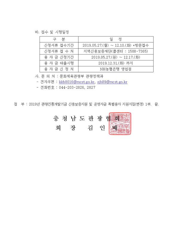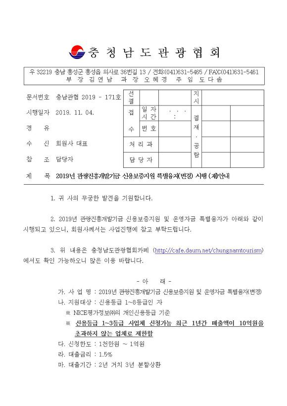 2019년 관광진흥개발기금 신용보증지원 특별융자(변경) 시행 (재)안내 작성자충청남도관광협회|작성시간19.11.04|조회수33 목록 댓글 0 글자크기 작게가 글자크기 크게가 [첨부] 2019년 관광진흥개발기금 신용보증지원 및 운영자금 지원지침(변경).hwp 첨부파일첨부된 파일이 3개 있습니다. jpg 파일 2019-171호(2019년 관광진흥개발기금 신용보증지원 및 운영자금 특별융자 지원지침(변경) 안내)001.jpg 다운로드 jpg 파일 2019-171호(2019년 관광진흥개발기금 신용보증지원 및 운영자금 특별융자 지원지침(변경) 안내)002.jpg 다운로드 hwp 파일 [첨부] 2019년 관광진흥개발기금 신용보증지원 및 운영자금 지원지침(변경).hwp 다운로드 다음검색 현재 게시글 추가 기능 열기 북마크 공유하기 신고 센터로 신고 댓글 댓글 0 댓글쓰기 답글쓰기 댓글 리스트