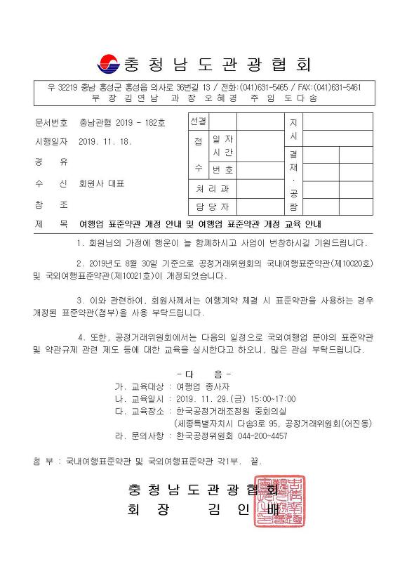 여행업 표준약관 개정 안내 및 여행업 표준약관 개정 교육 안내 작성자충청남도관광협회|작성시간19.11.18|조회수60 목록 댓글 0 글자크기 작게가 글자크기 크게가 [첨부1] 국내여행표준약관(2019.8.30.개정).hwp [첨부1] 국외여행표준약관(2019.8.30.개정).hwp 첨부파일첨부된 파일이 3개 있습니다. jpg 파일 2019-182호(여행업 표준약관 개정 안내 및 여행업 표준약관 개정 교육 안내)001.jpg 다운로드 hwp 파일 [첨부1] 국내여행표준약관(2019.8.30.개정).hwp 다운로드 hwp 파일 [첨부1] 국외여행표준약관(2019.8.30.개정).hwp 다운로드 다음검색 현재 게시글 추가 기능 열기 북마크 공유하기 신고 센터로 신고 댓글 댓글 0 댓글쓰기 답글쓰기 댓글 리스트