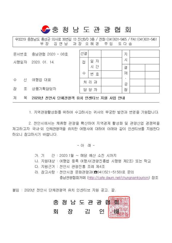 2020년 천안시 단체관광객 유치 인센티브 지원 사업 안내 작성자충청남도관광협회|작성시간20.01.14|조회수40 목록 댓글 0 글자크기 작게가 글자크기 크게가 2020-08호(2020년 천안시 단체관광객 유치 인센티브 지원 사업 안내).hwp 2020 천안시 단체관광객 유치를 위한 인센티브 지원계획 공고문.hwp 첨부파일첨부된 파일이 3개 있습니다. jpg 파일 2020-08호(2020년 천안시 단체관광객 유치 인센티브 지원 사업 안내)001.jpg 다운로드 hwp 파일 2020-08호(2020년 천안시 단체관광객 유치 인센티브 지원 사업 안내).hwp 다운로드 hwp 파일 2020 천안시 단체관광객 유치를 위한 인센티브 지원계획 공고문.hwp 다운로드 다음검색 현재 게시글 추가 기능 열기 북마크 공유하기 신고 센터로 신고 댓글 댓글 0 댓글쓰기 답글쓰기 댓글 리스트