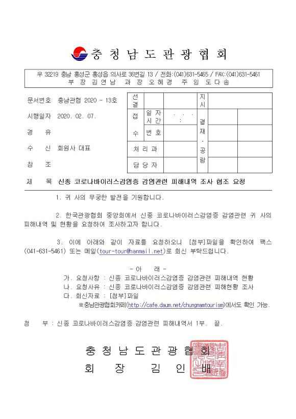 신종 코로나바이러스감염증 감염관련 피해내역 조사 협조 요청 작성자충청남도관광협회|작성시간20.02.07|조회수49 목록 댓글 0 글자크기 작게가 글자크기 크게가 2020-013호(별첨_신종 코로나바이러스감염증 감연관련 피해내역서 (작성요령)).pdf 2020-013호(첨부 신종 코로나바이러스감염증관련 피해내역서).hwp 첨부파일첨부된 파일이 3개 있습니다. jpg 파일 2020-013호(신종 코로나바이러스감염증 감염관련 피해내역 조사 협조 요청)001.jpg 다운로드 pdf 파일 2020-013호(별첨_신종 코로나바이러스감염증 감연관련 피해내역서 (작성요령)).pdf 다운로드 hwp 파일 2020-013호(첨부 신종 코로나바이러스감염증관련 피해내역서).hwp 다운로드 다음검색 현재 게시글 추가 기능 열기 북마크 공유하기 신고 센터로 신고 댓글 댓글 0 댓글쓰기 답글쓰기 댓글 리스트
