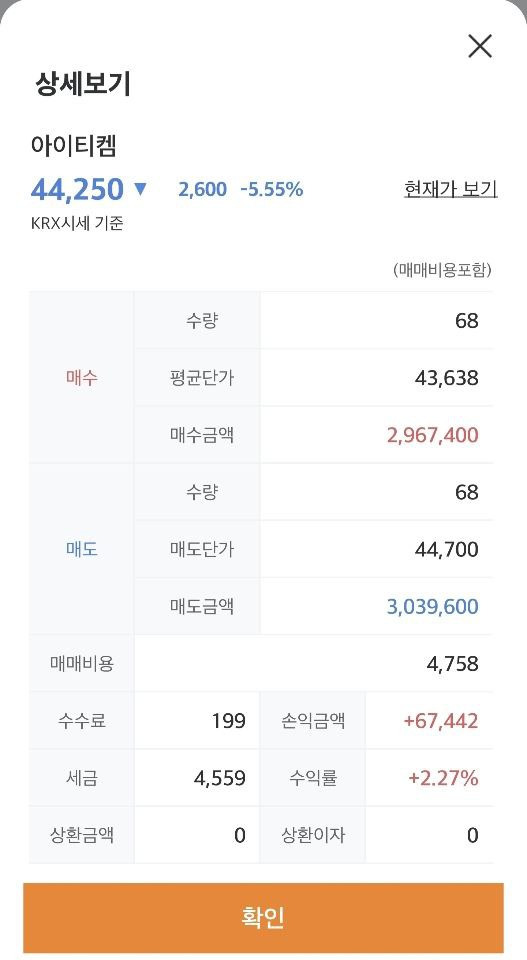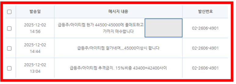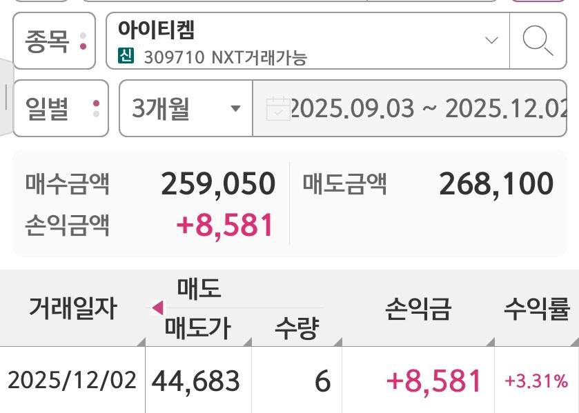 12월2일 아이티켐 3% 수익 44,600원 매도 후 45,350원까지 상승 후 45,150원 마감
