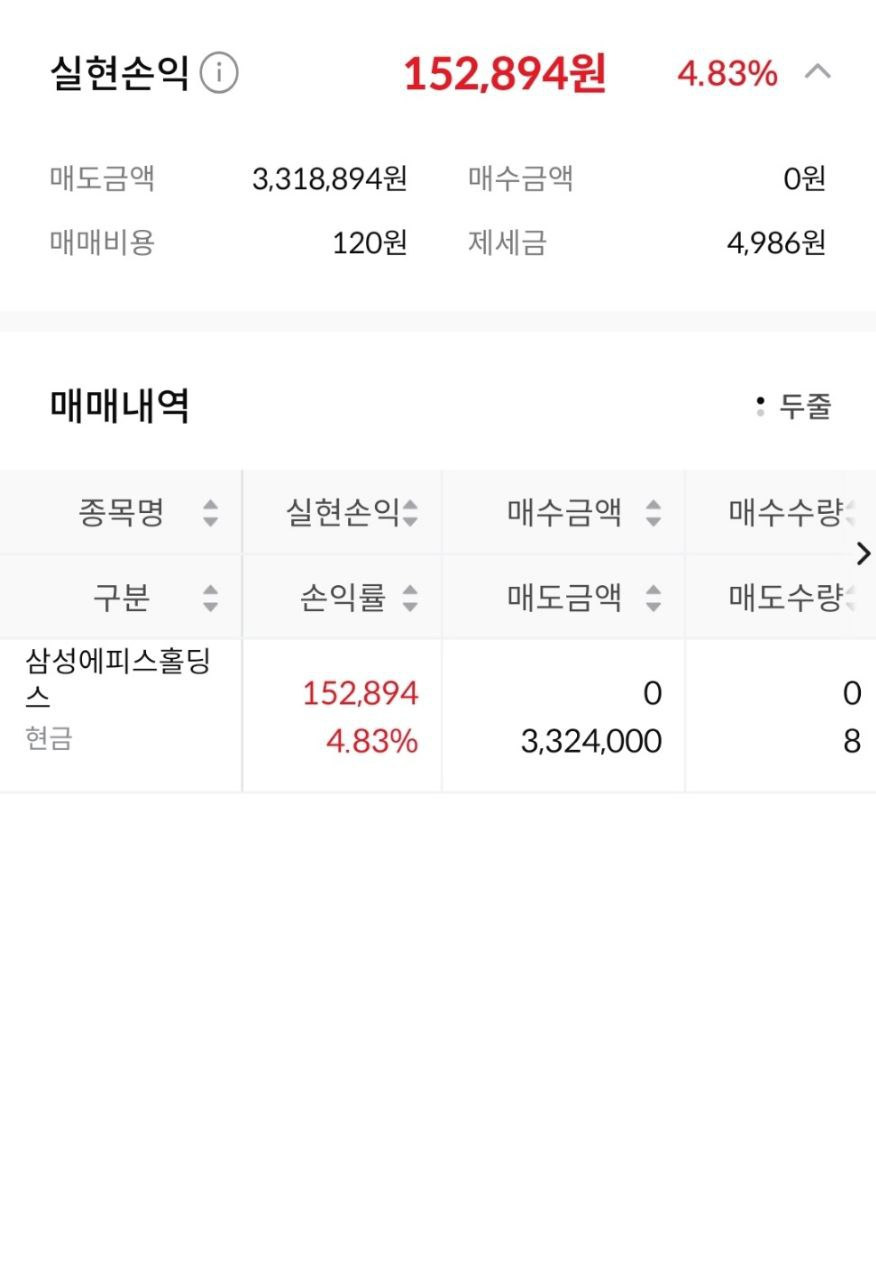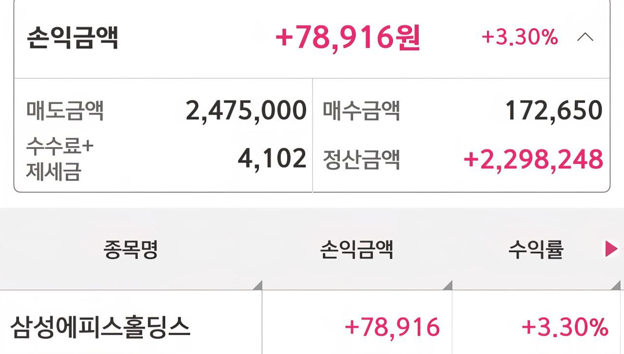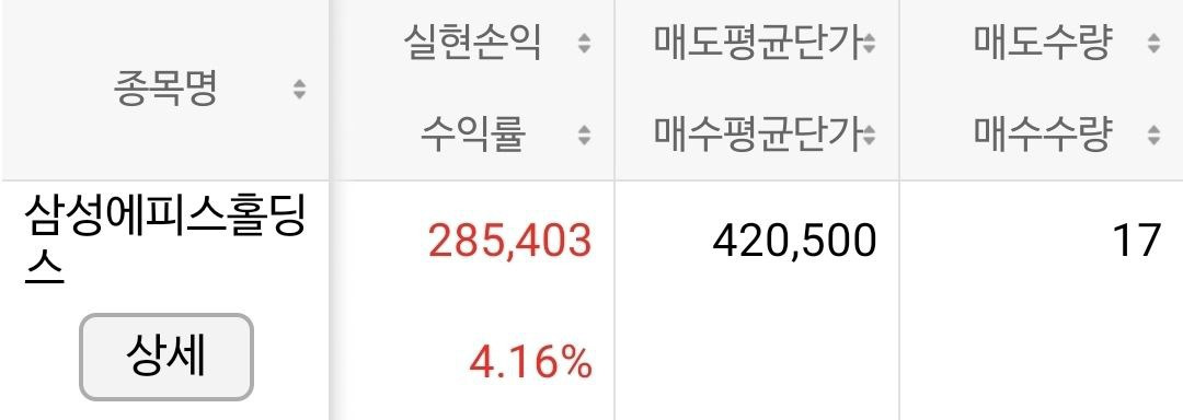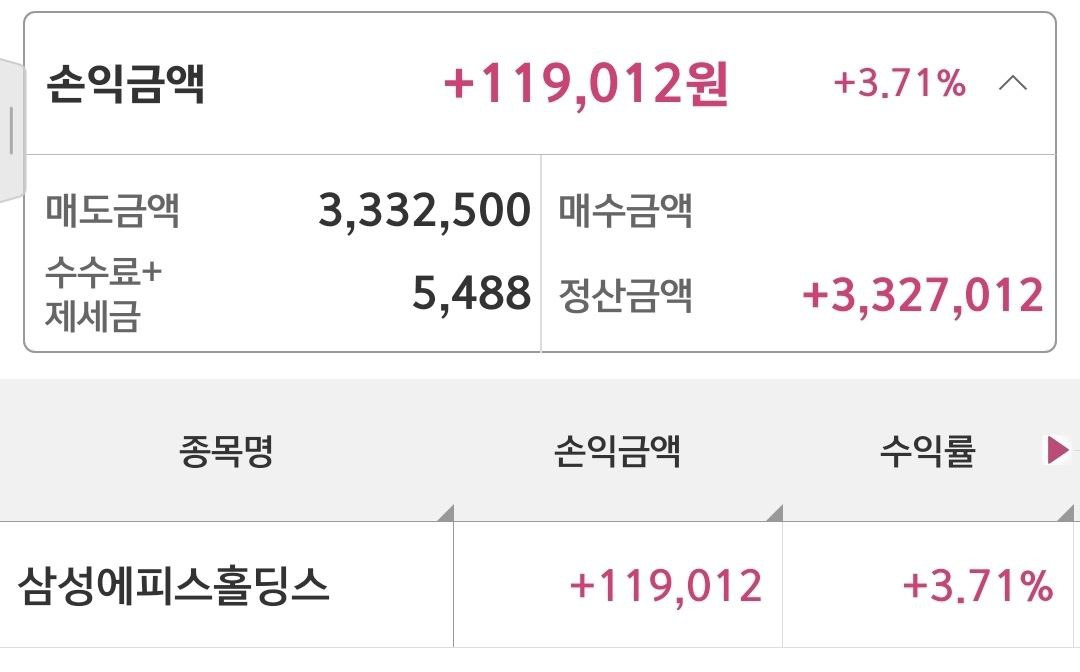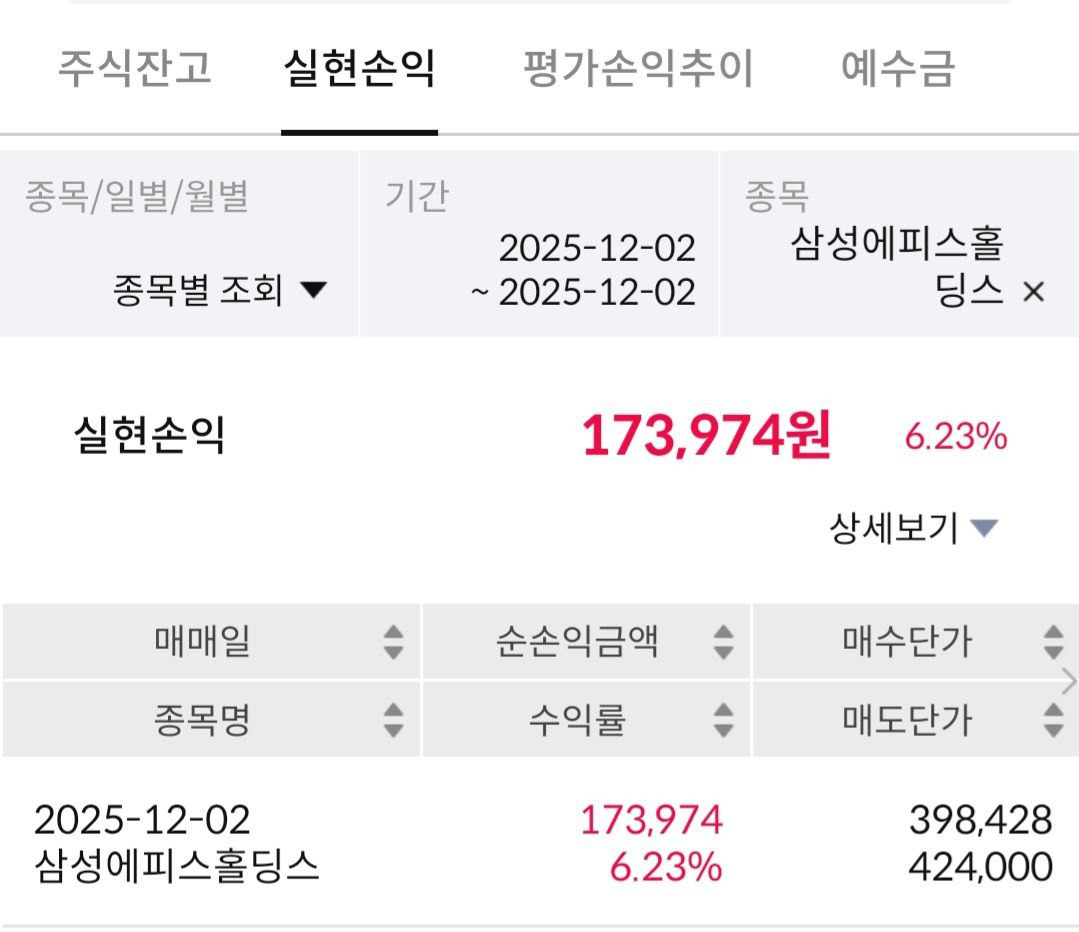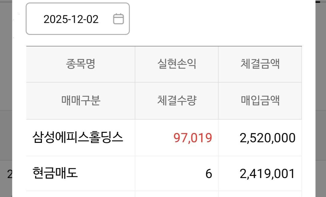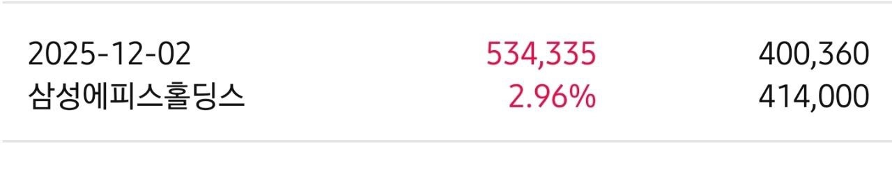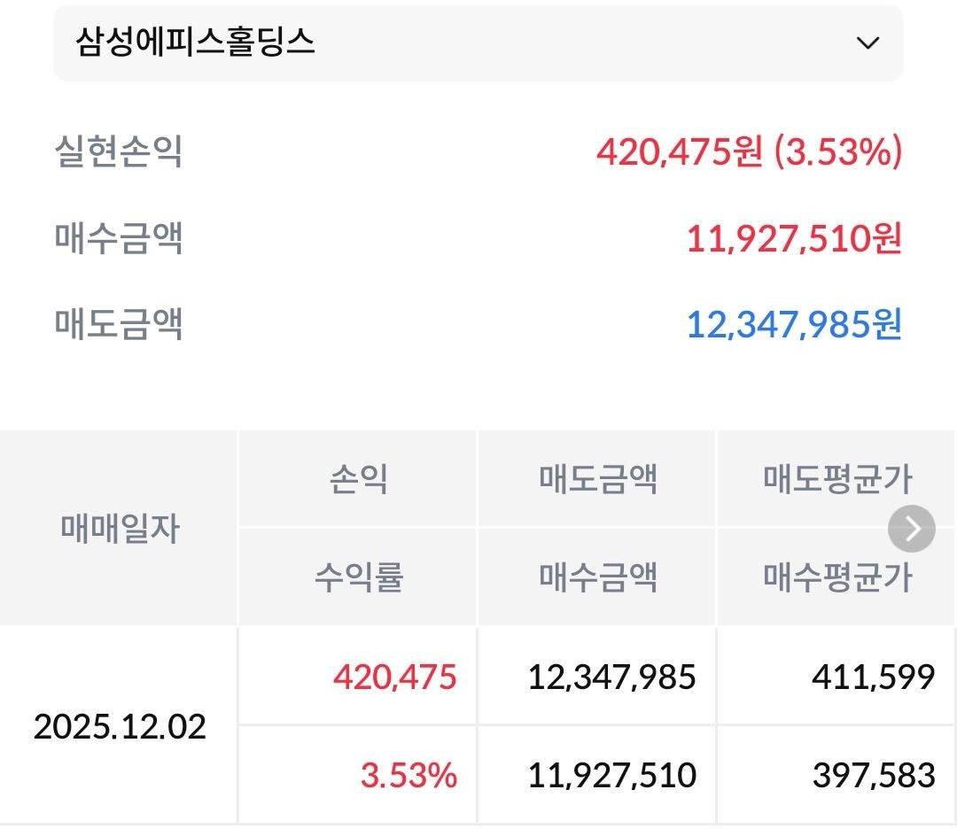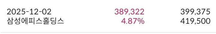 12월2일 삼성에피스홀딩스 4% 수익 416,000원 매도 후 449,000원까지 상승 후 442,000원 마감