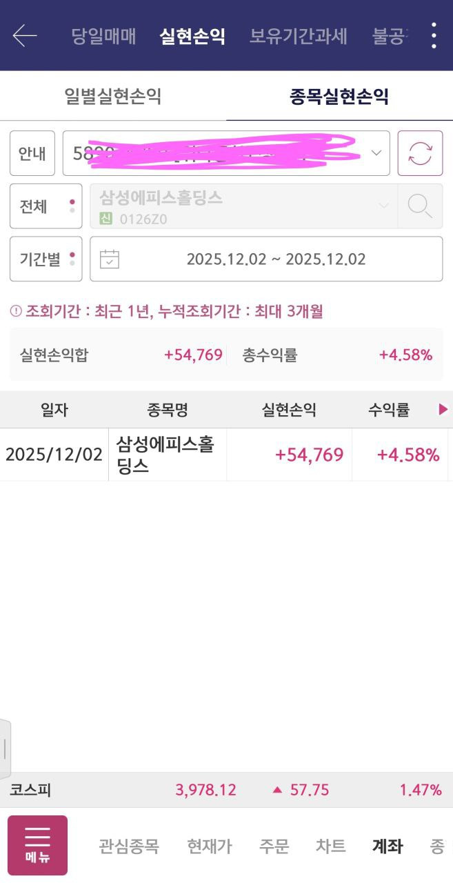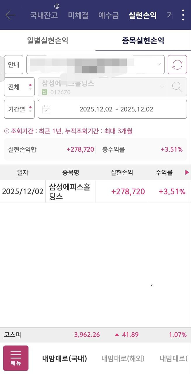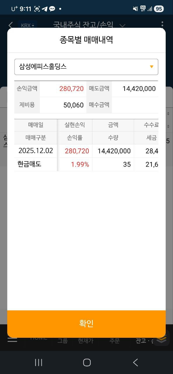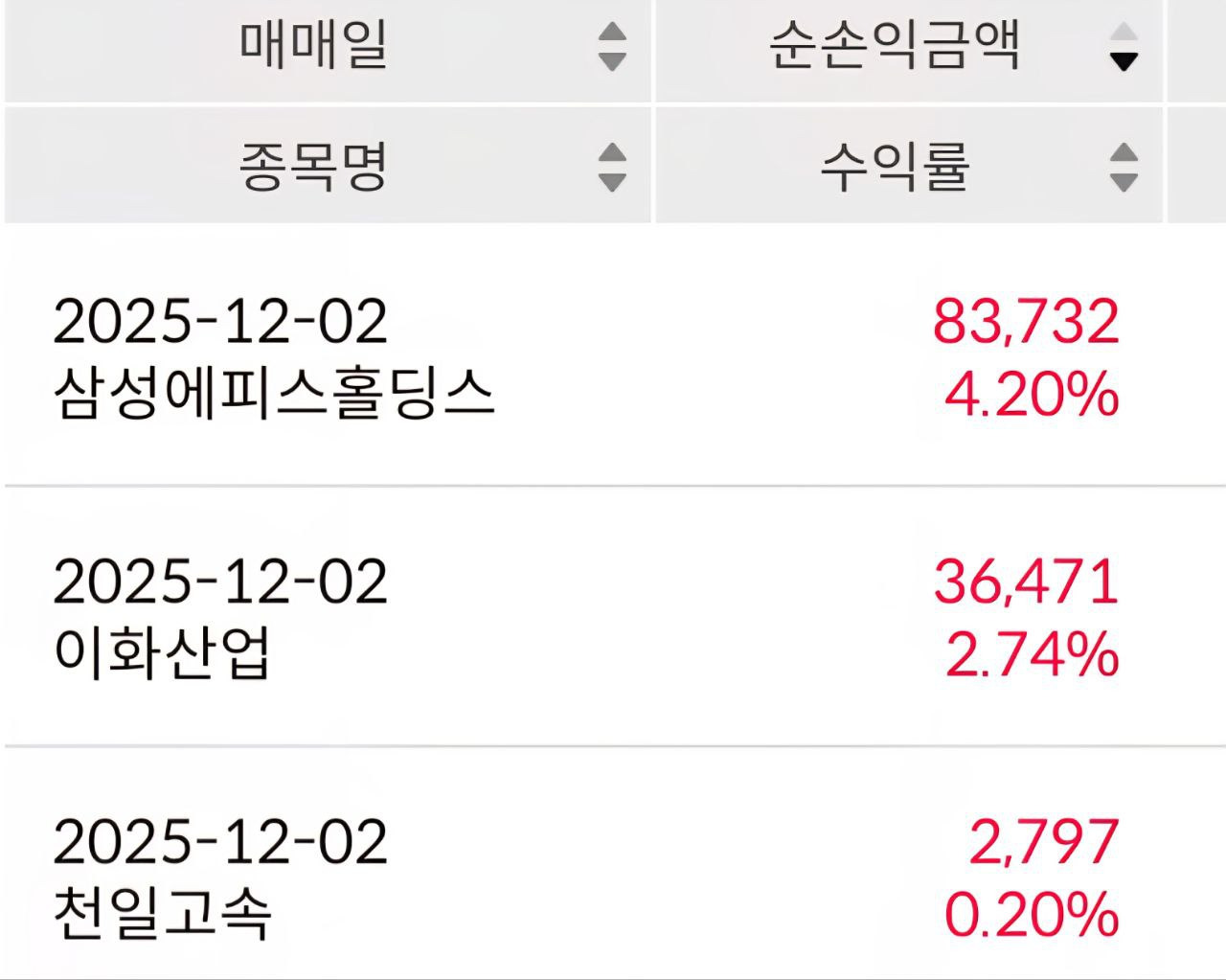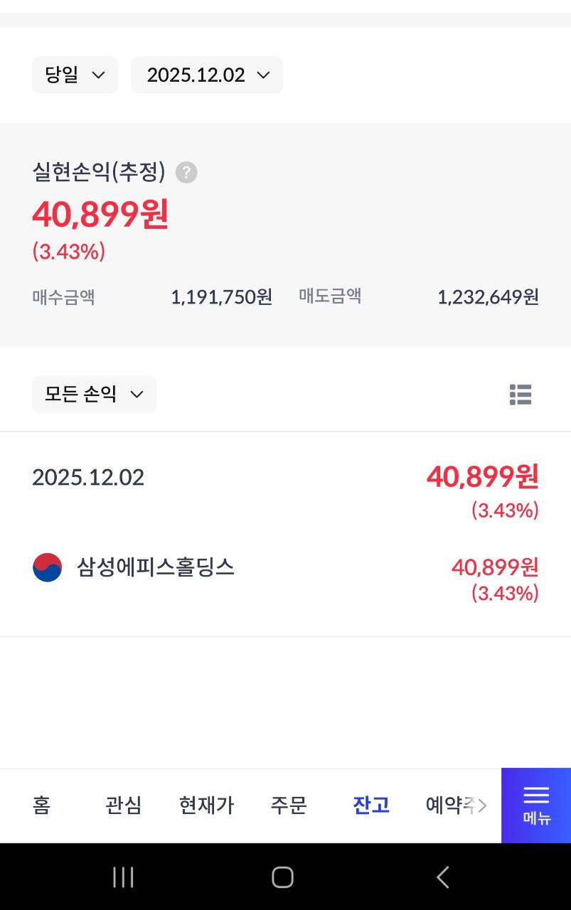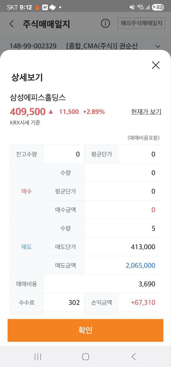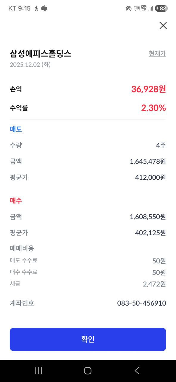12월2일 삼성에피스홀딩스 4% 수익 416,000원 매도 후 449,000원까지 상승 후 442,000원 마감