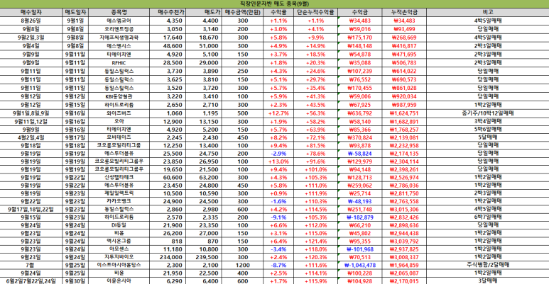 □ 9월달 직장인문자반성적보고-단순누적수익률 116% / 33종목 추천 5종목 손절 / 3,000만원 기준 217만원 수익