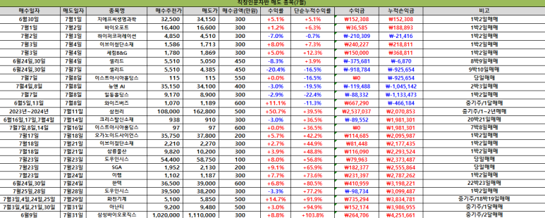 □ 7월달 직장인문자반성적보고-단순누적수익률 104% / 25종목 추천 7종목 손절 / 3,000만원 기준 425만원 수익