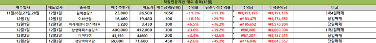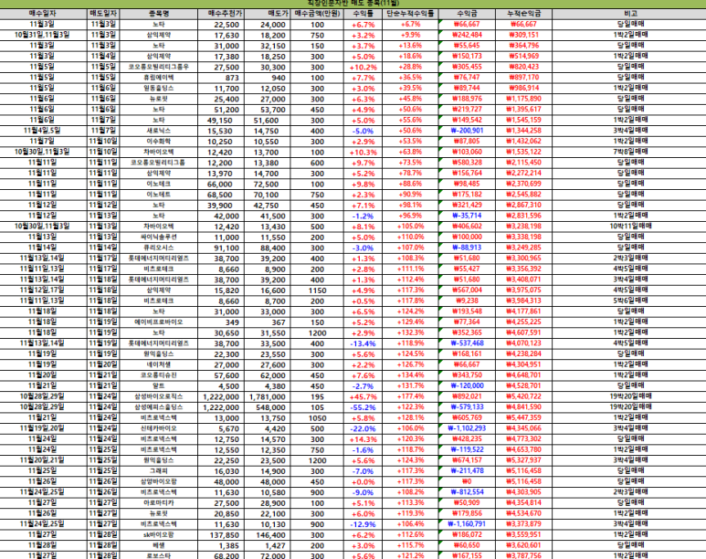 □ 11월달 직장인문자반성적보고-단순누적수익률 121% / 51종목 추천 11종목 손절 / 3,000만원 기준 379만원 수익