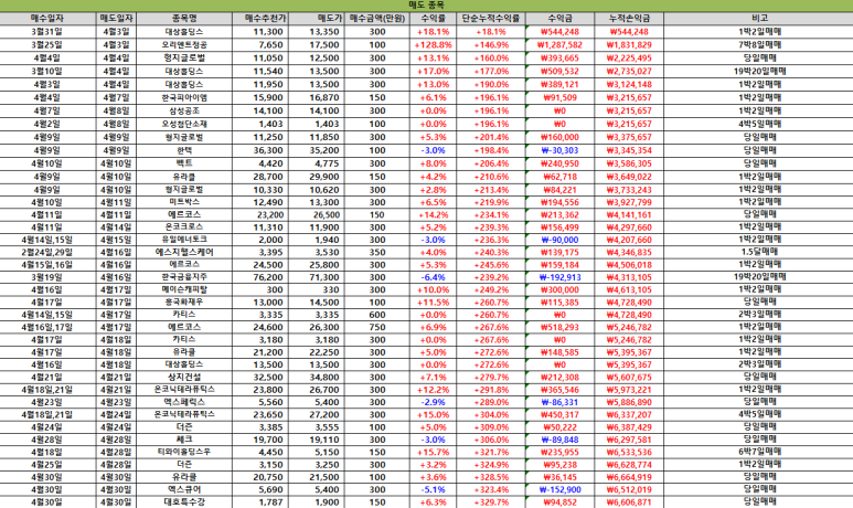 □ 4월달 직장인문자반성적보고-단순 누적수익률 330% / 37종목 추천 5종목 손절 / 3,000만원 기준 660만원 수익실현
