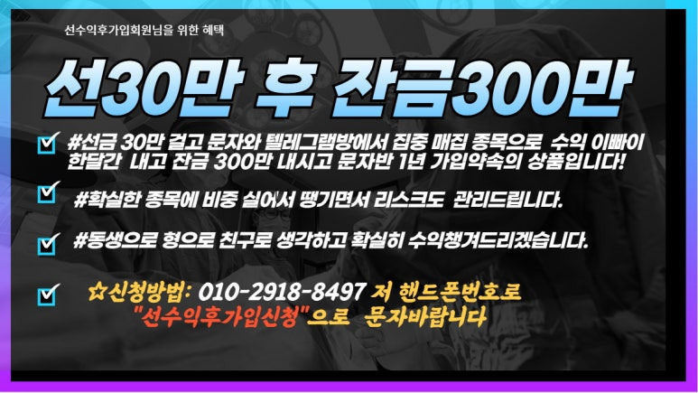 -가입문의는 010-2918-8497 문자로 문의 바랍니다(준스투자그룹은 자본시장법을 준수하고 일대일자문금지 및 쌍방향 소통금지 등의 법을 준수합니다. 주식투자상품은 원금보장 상품이 아니므로 투자의 책임은 투자자 본인에게 귀속되며 준스투자그룹은 유사투자문업체로써 정보제공의 역할만 수행합니다.)
