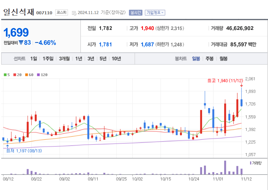 2. 일신석재: 트러프의 대북정책 변화로 눌림목 매수 ,손절가 3%설정