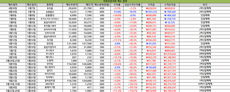 □ 5월달 직장인문자반성적보고-단순누적수익률 119% / 27종목 추천 3종목 손절 / 3,000만원 기준 310만원 수익