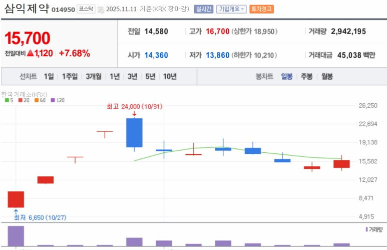 오랜만에 신규상장주 삼익제약 상장일 당시 시가에서 시가이하-3%선 진입공식 이후 4일간 상한가