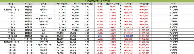 11월12일 종목브리핑 (삼익제약,비츠로테크,비츠로셀)코오롱모빌리티그룹 10%수익실현,삼익제약 5%수익실현,이노테크 12%수익실현