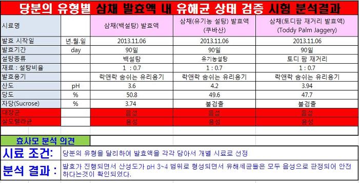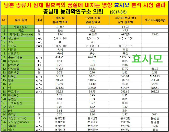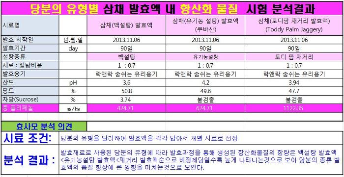 발효액을 담을때 필수불가결하게 사용하는 당분의 종류가 "발효액의 품질에 미치는 영향"을 [충남대 농업과학연구소]에 의뢰하여