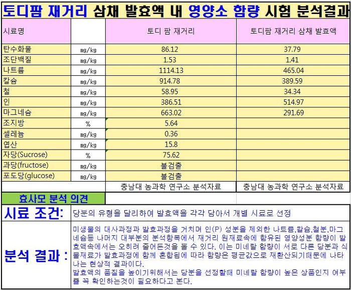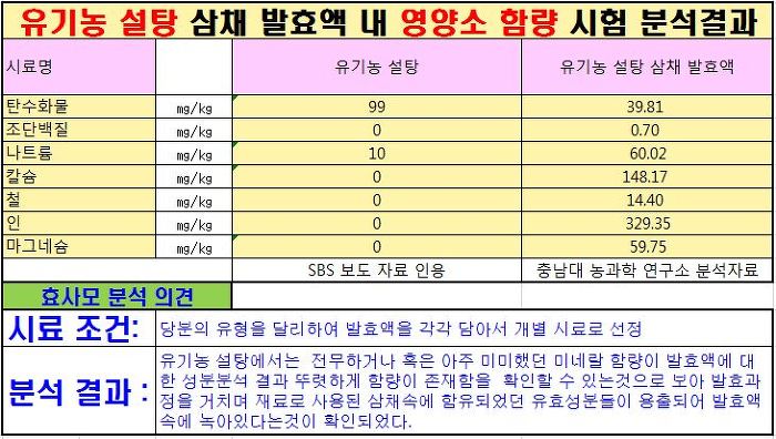 그런데 분석시험 결과를 보면 정제당(갈색설탕)에서는 전혀 검출되지않은 각종 영양성분(나트륨,칼슘,철,인,마그네슘)등이 발효액속에서는 뚜렷하게 검출되었는데 이는 바로 발효과정을 거치면서 재료속의 유효성분들이 발효액속으로 용출되었기때문입니다.