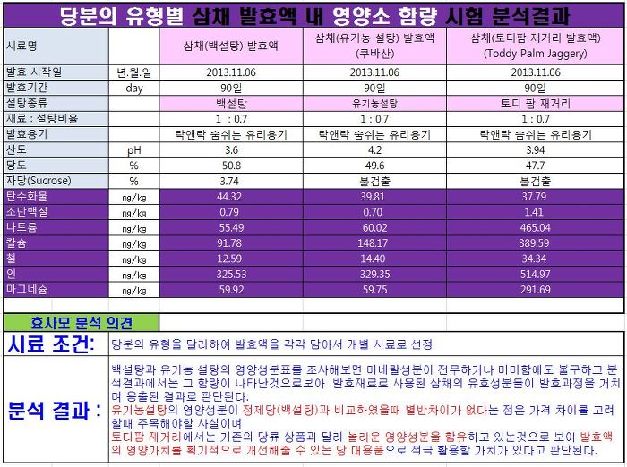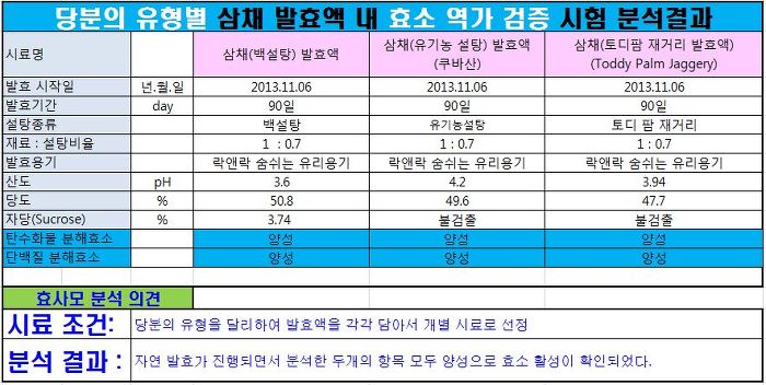 발효액을 만들때 사용하는 설탕의 종류가 발효액의 품질에 미치는 영향에 대한 시험분석 결과를 통해 발효액은 전통 발효식품의 일원임이 명명 백백하게 밝혀졌으며 투입하는 당분의 종류 즉 어떤 설탕을 사용하느냐에 따라 만들어진 발효액속에 영양성분 함량이 뚜렷한 차이를 보인다는 것을 확인할 수 있었습니다.
