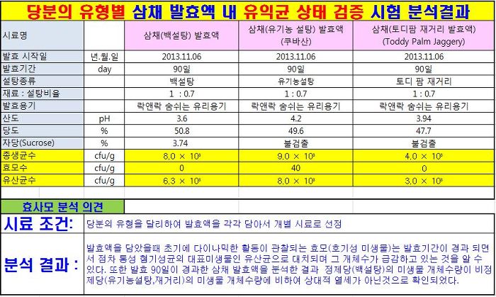 시료로 사용된 발효액의 발효기간이 약 90일 정도 경과된것 1종에 대한 분석이다보니 당분 제품의 종류가 유익균의 개체수에 미치는 영향에 대한 분석을 단정하기는 어려운듯합니다. 다만 정제당보다는 비정제당을 상요한 시료에서 유산균수가 조금더 높게 나왔지만